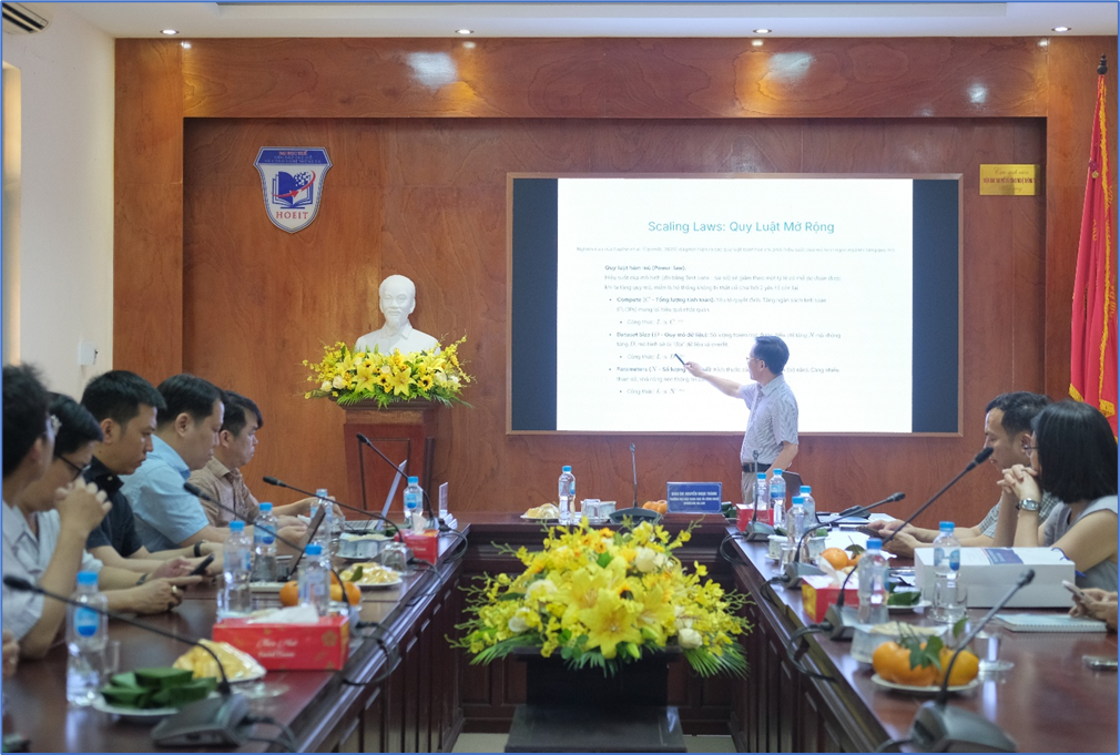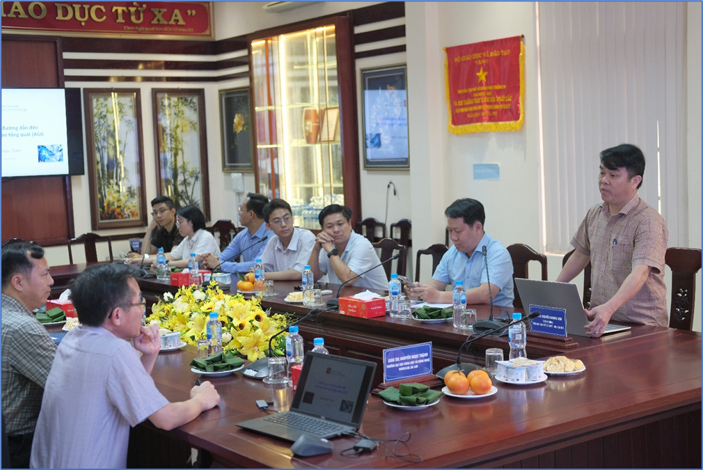 Tại buổi làm việc, GS.TSKH. Nguyễn Ngọc Thành đã trình bày chuyên đề về Trí tuệ nhân tạo tổng quát (Generative AI). Giáo sư nhấn mạnh rằng AI không còn là công cụ hỗ trợ đơn thuần mà đang trở thành một "đối tác sáng tạo" trong mọi lĩnh vực từ giáo dục, y tế đến sản xuất. Giáo sư cập nhật những bước tiến mới nhất của các mô hình ngôn ngữ lớn và khả năng ứng dụng thực tiễn của GenAI trong việc tối ưu hóa quy trình đào tạo từ xa. Ông lưu ý về vấn đề đạo đức AI và sự cần thiết của việc xây dựng các mô hình AI đặc thù, phù hợp với bối cảnh văn hóa và ngôn ngữ Việt Nam.